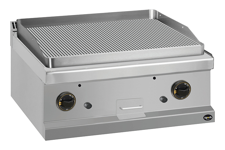 Открытая газовая сковорода Apach APTG-77TR/PL 700-й серии предназначена для обжарки мяса, рыбы и овощей на предприятиях общественного питания и торговли. Модель с закругленными краями и бортами оснащена электромеханической панелью управления с 2 терморегуляторами, горелками с пьезоэлектрическим поджигом и системой стабилизации пламени и выдвижным лотком для сбора остатков пищи, масла и жира. Корпус, панель управления и вытяжная решетка выполнены из нержавеющей стали AISI 304, рабочая поверхность – из конструкционной стали, боковые и задняя панели - из нержавеющей стали AISI 430, лоток и горелка - из нержавеющей стали.