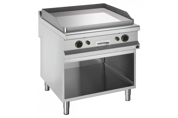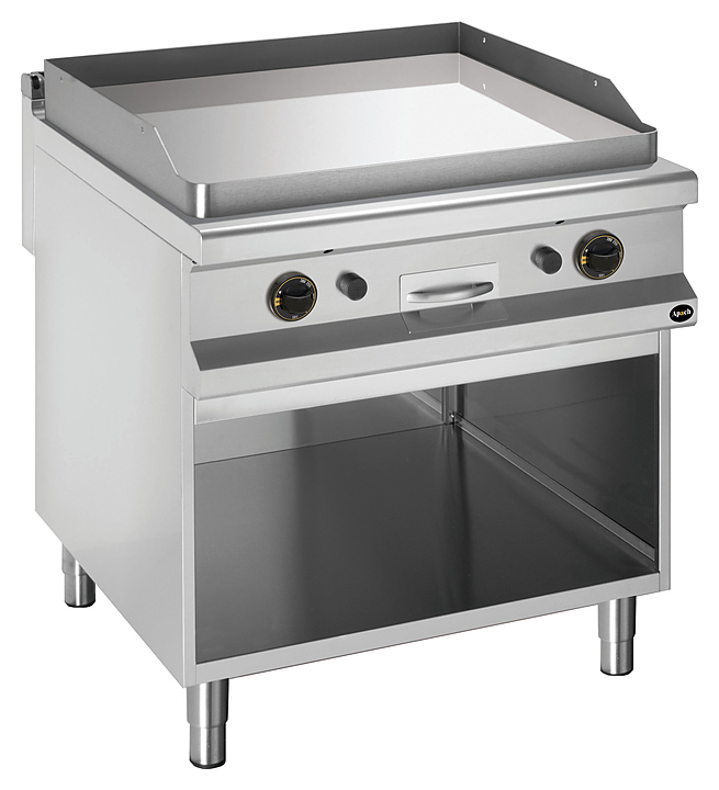 Открытая газовая сковорода Apach APTG-77PL/PL 700-й серии предназначена для обжарки мяса, рыбы и овощей на предприятиях общественного питания и торговли. Модель с закругленными краями и бортами оснащена электромеханической панелью управления с 2 терморегуляторами, горелками с пьезоэлектрическим поджигом и системой стабилизации пламени, выдвижным лотком для сбора остатков пищи, масла и жира и открытой подставкой с регулируемыми по высоте ножками.